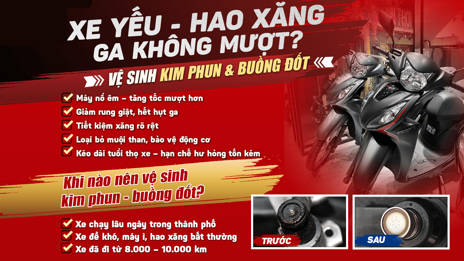 Xe yếu, hao xăng, ga không mượt. Nguyên nhân rất có thể đến từ kim phun & buồng đốt bám cặn bẩn sau thời gian dài sử dụng!