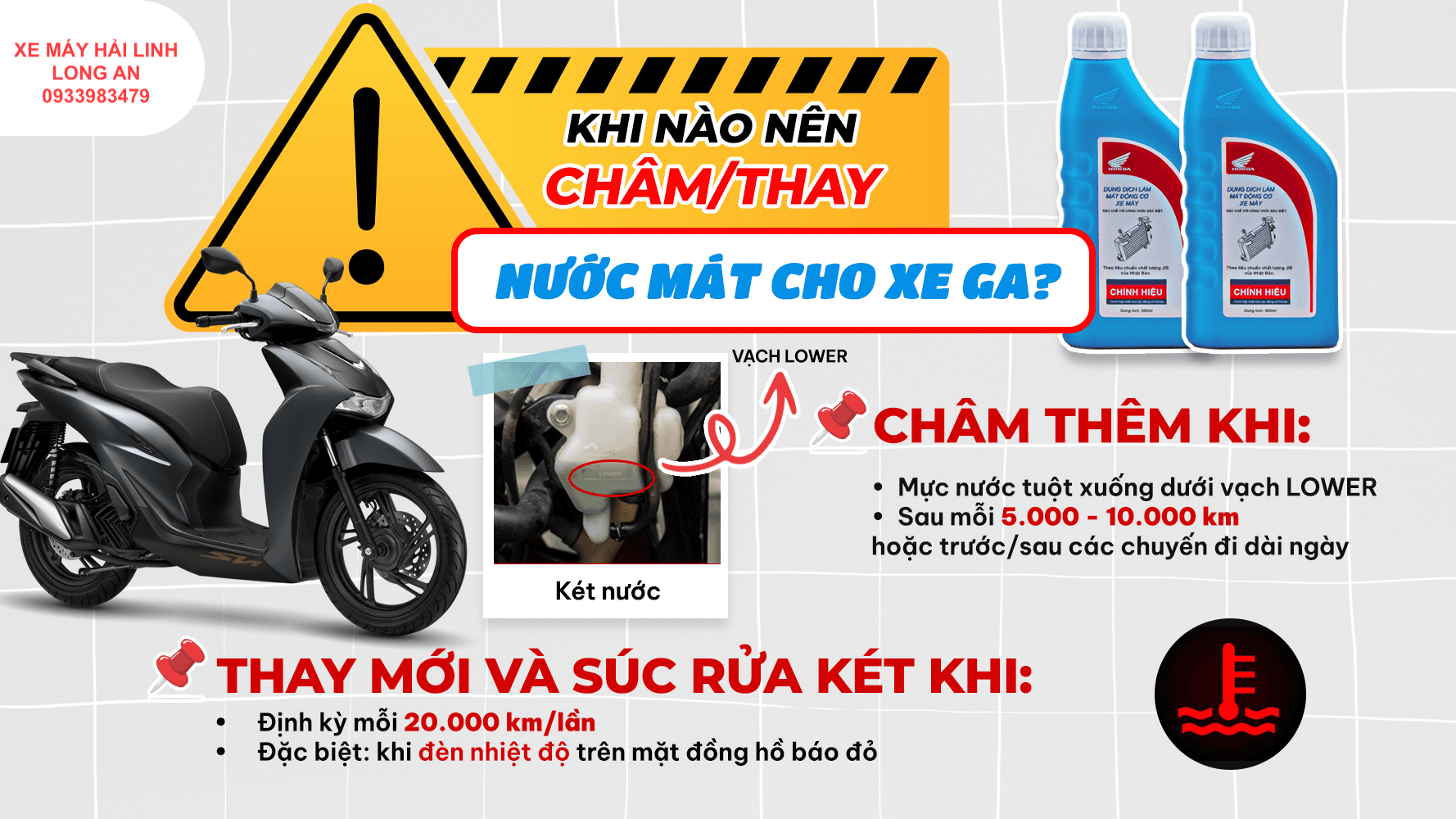 Sau những chuyến đi dài, mực nước mát xe bạn chắc hẳn đã hao hụt ít nhiều. Hãy kiểm tra ngay và ghé Xe máy Hải Linh Long An để kỹ thuật viên kiểm tra và thay đúng loại nước chính hãng nhé!